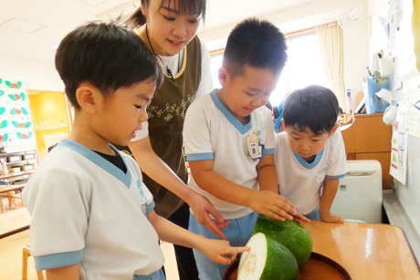 園には給食室があり、管理栄養士が栄養管理を行い献立を作成しています。毎日できたての安全で、安心できる温かい昼食を提供するだけでなく、様々なメニューや食材に出会う機会になっています。食物アレルギーの園児に対しても、管理栄養士との相談をおこない対応しています。