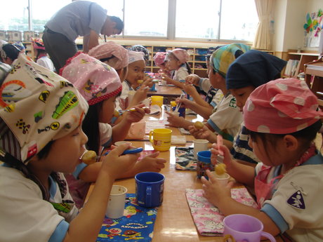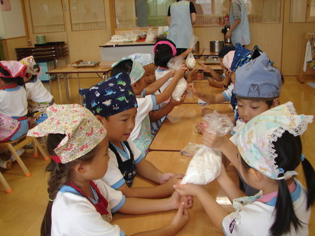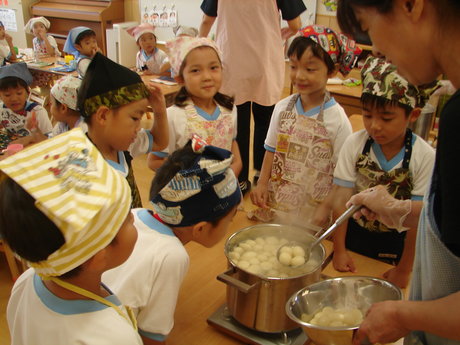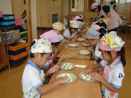 年長組がおだんごを作り、仲良しクラスの年中、年少組へおすそわけ。